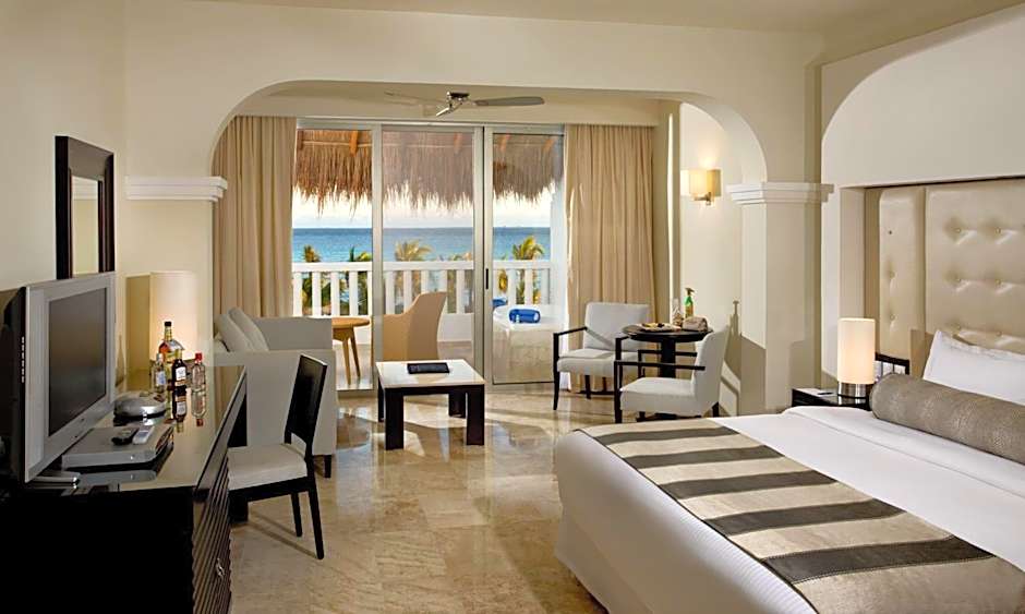 DELUXE JR SUITE SWIMOUT is 603 square feet and includes a king-size bed 150-183 width plus balcony, terrace, desk, satellite tv , cable tv, hairdryer, tea and coffee making facilities , and safe.